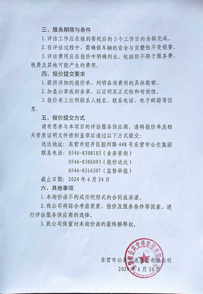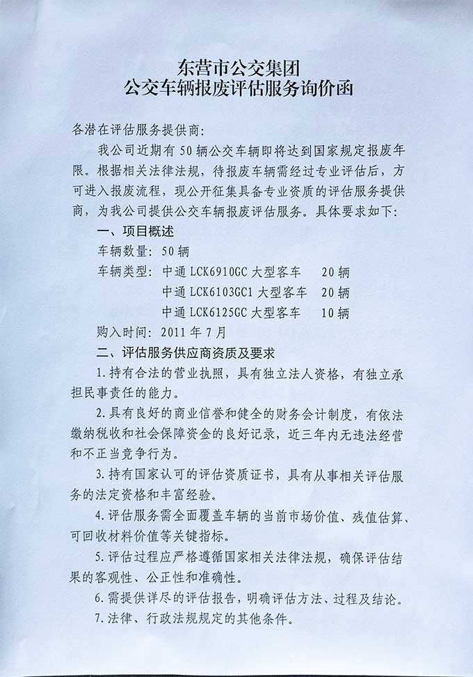 我公司近期有50輛公交車輛即將達到國家規(guī)定報廢年限。根據(jù)相關(guān)法律法規(guī),待報廢車輛需經(jīng)過專業(yè)評估后,方可進入報廢流程,現(xiàn)公開征集具備專業(yè)資質(zhì)的評估服務(wù)提供商,為我公司提供公交車輛報廢評估服務(wù)。具體要求如下: