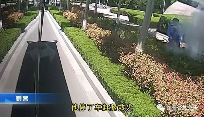 “那邊著火了,你們在車里稍等一下?!?月16日,東一路英華園附近的一處的綠化帶突然起火,路過的公交駕駛員劉寶杰發(fā)現(xiàn)后,第一時間靠邊停車并及時滅火。這一幕被車內(nèi)乘客記錄下來。