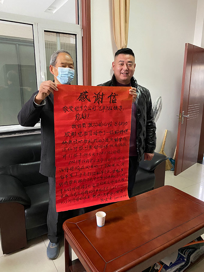 12月9日上午,東營市公交公司汽車六隊的辦公樓里來了兩位手捧大紅色感謝信的老人家。上面寫著“感謝您教育培養(yǎng)了一位好師傅,他熱情地幫助并找回了遺失的背包?!?br/> 原來,在12月8日上午,家住西城的吳女士和老伴從墾利區(qū)返程時乘坐了袁永文師傅駕駛的117路公交車,在到達濟南路附近下車后,發(fā)現(xiàn)自己的隨身斜跨的背包不見了。這時才想到可能是遺落在剛剛的公交車上,“雖然是個小破包,里面也就一百來塊錢,可是手機、鑰匙、老年卡都在包里。”回想起當時發(fā)現(xiàn)背包丟失后的吳女士非常著急,“手機還是孩子剛給買的,還新得很呢”。焦急的吳女士便跑到附近的濱海派出所去詢問該如何,“人家給我出了個主意,打上出租車去追”。吳女士和老伴便急忙攔上了一輛出租車去追趕。吳女士說自己老伴平時出門也不帶電話,幸虧出租車駕駛員人也很好,用自己的電話撥打了吳女士背包里的手機。當時還在駕駛車輛的袁永文師傅并不知道這一切,當他聽到車廂內(nèi)有電話聲響,經(jīng)乘客提醒得知有個背包在座位上,考慮到可能是失主在尋找。袁師傅便在下一站把車??柯愤吅?,從包里拿出電話,撥了回去,這樣雙方才取得了聯(lián)系。