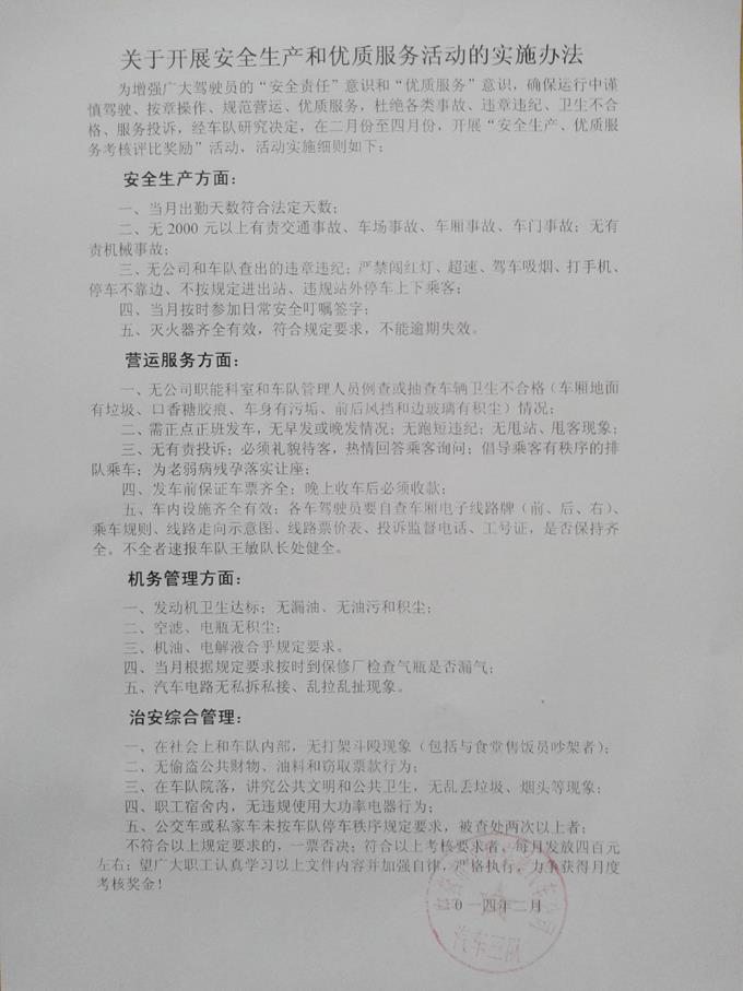 為增強廣大駕駛員的“安全責任”意識和“優(yōu)質(zhì)服務”意識,促使駕駛員出車前做好車輛檢查和衛(wèi)生保潔,運行中謹慎駕駛、優(yōu)質(zhì)服務,收車后規(guī)范停車,減少各類違章違紀、服務投訴和行車事故,杜絕單車衛(wèi)生不合格和不收款現(xiàn)象發(fā)生,實現(xiàn)職工薪金跨年度平穩(wěn)過渡,市公交公司汽車三隊充分利用部分工資結(jié)余,發(fā)揮經(jīng)濟杠桿作用,自2014年2月份起制定實施了“安全生產(chǎn)和優(yōu)質(zhì)服務考評獎勵辦法”。
