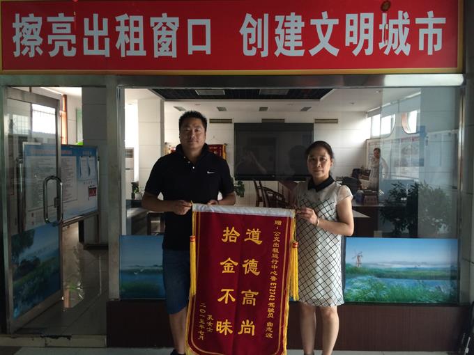 出租車駕駛員曲志波發(fā)現(xiàn)遺失物品后立即送到市公交公司出租運(yùn)營中心,在運(yùn)營中心的幫助下聯(lián)系上了孔女士,將遺失在出租車上的物品如數(shù)歸還,乘客為了表示對(duì)出租車駕駛員的感謝,于7月27日委托其丈夫送來錦旗一面。
