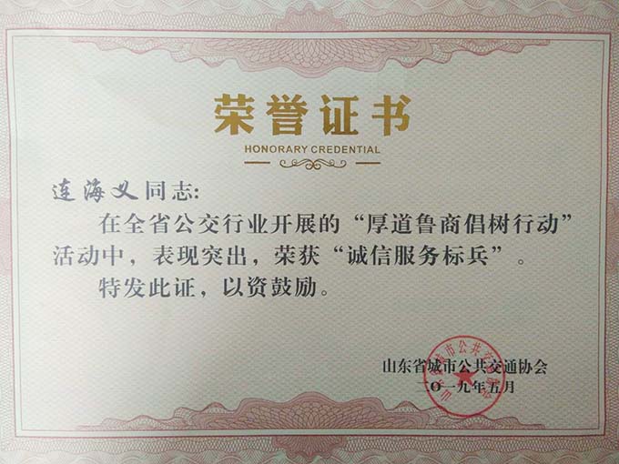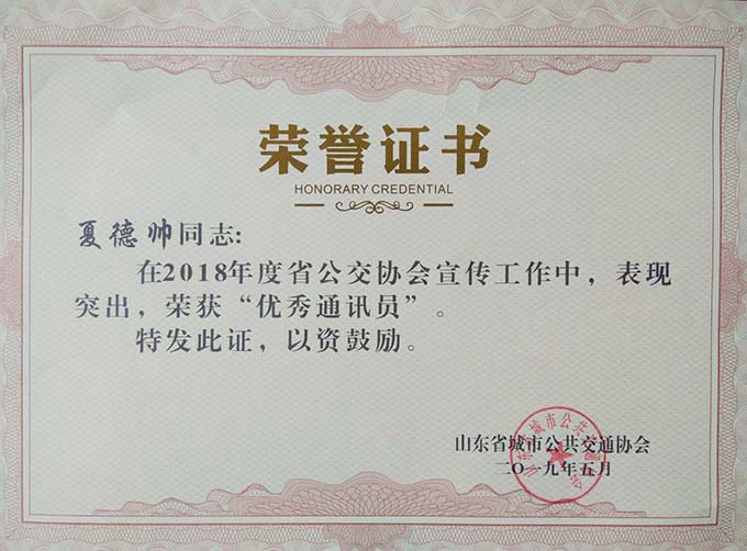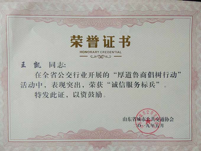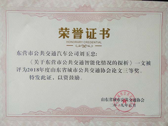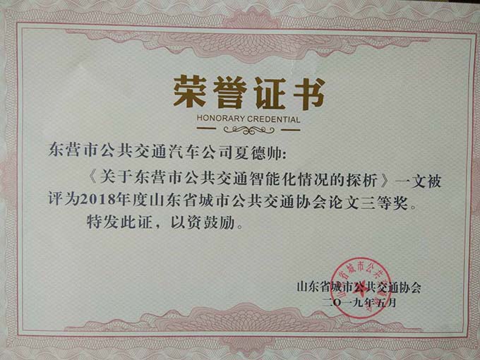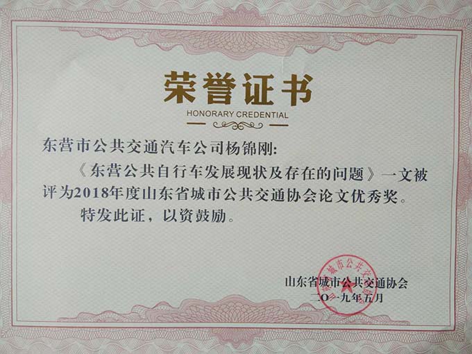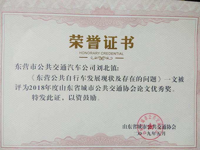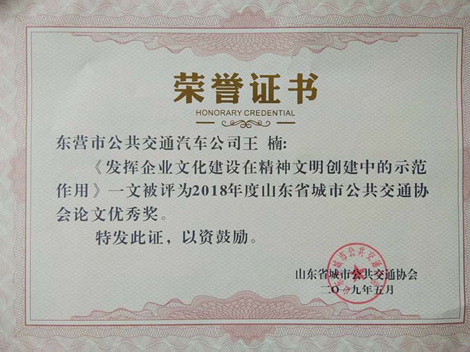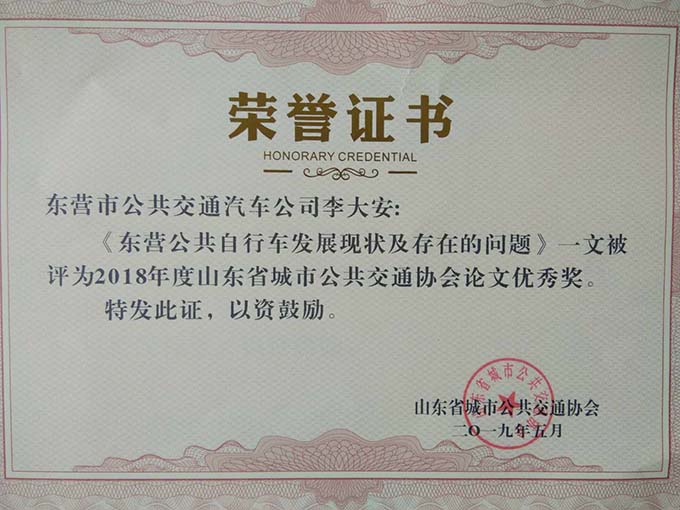 大會分別表彰了厚道魯商誠信公交企業(yè)、線路、標兵及宣傳工作先進單位、優(yōu)秀通訊員和優(yōu)秀研究成果論文。公司獲得山東省城市公共交通行業(yè)厚道魯商倡樹行動“誠信經(jīng)營企業(yè)”和山東省城市公共交通行業(yè)宣傳工作“先進單位”榮譽稱號,9路車組獲得 “誠信公交線路”榮譽稱號,公司王凱、耿治建、連海義等三名同志獲得全省公交行業(yè)“誠信服務(wù)標兵”榮譽稱號,夏德帥同志獲得全省公共交通行業(yè)“優(yōu)秀通訊員”榮譽稱號。由公司選送的《關(guān)于東營市公共交通智能化情況的探析》《發(fā)揮企業(yè)文化建設(shè)在精神文明創(chuàng)建中的示范作用》《東營公共自行車發(fā)展現(xiàn)狀及存在的問題》等3篇論文分別獲得三等獎1項,優(yōu)秀獎2項,并成功入選全省城市公共交通行業(yè)優(yōu)秀論文集。