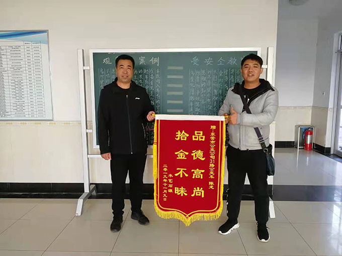 2019年11月18日下午,公交公司汽車三隊(duì)來(lái)了一名手拿錦旗的年輕小伙,說(shuō)是要對(duì)31路駕駛員陳龍拾金不昧的行為表示感謝。