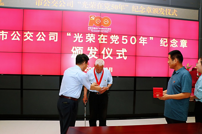 6月24日上午,在中國(guó)共產(chǎn)黨成立100周年即將到來(lái)之際,東營(yíng)公交組織開展了“光榮在黨50年”紀(jì)念章頒發(fā)儀式。公司黨委書記趙龍、經(jīng)理劉海、副經(jīng)理孫紅光、景洪培和黨齡50周年老黨員以及黨員代表等參加了頒發(fā)活動(dòng)。