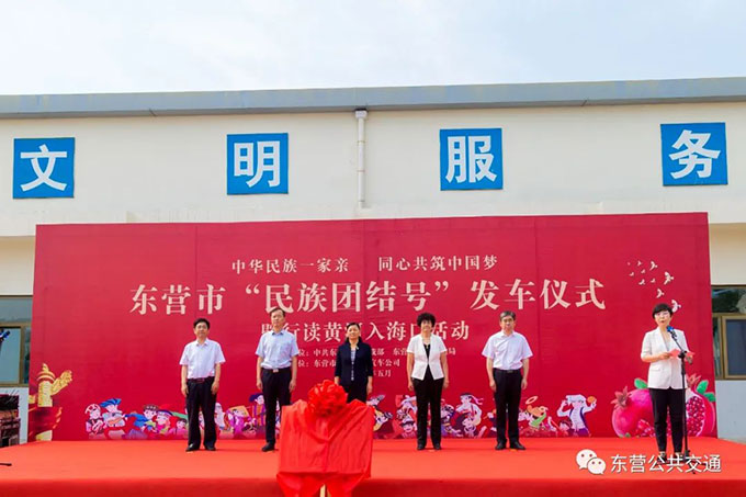 儀式現(xiàn)場,民族團(tuán)結(jié)號(hào)公交車整裝待發(fā),車身煥然一新,貼有“中華民族一家親、同心共筑中國夢(mèng)”“各民族像石榴籽一樣緊緊擁抱雜一起”等字樣,融入東營民族團(tuán)結(jié)進(jìn)步“石榴籽”“石榴花開黃河口”等地域元素,生動(dòng)展示了各民族群眾在黃河入海口攜手團(tuán)結(jié)奮斗、共創(chuàng)美好生活的故事,市公交公司黨委書記趙龍同志現(xiàn)場就民族團(tuán)結(jié)號(hào)公交車籌備情況作了匯報(bào)。市交通運(yùn)輸局黨組成員、市鐵路港航發(fā)展中心主任朱勝勇致辭,市人大常委會(huì)副主任張敏,市政協(xié)副主席王新明為東營市民族團(tuán)結(jié)號(hào)揭牌,市委常委、統(tǒng)戰(zhàn)部部長郭艷發(fā)表講話,并宣布東營市民族團(tuán)結(jié)號(hào)發(fā)車。