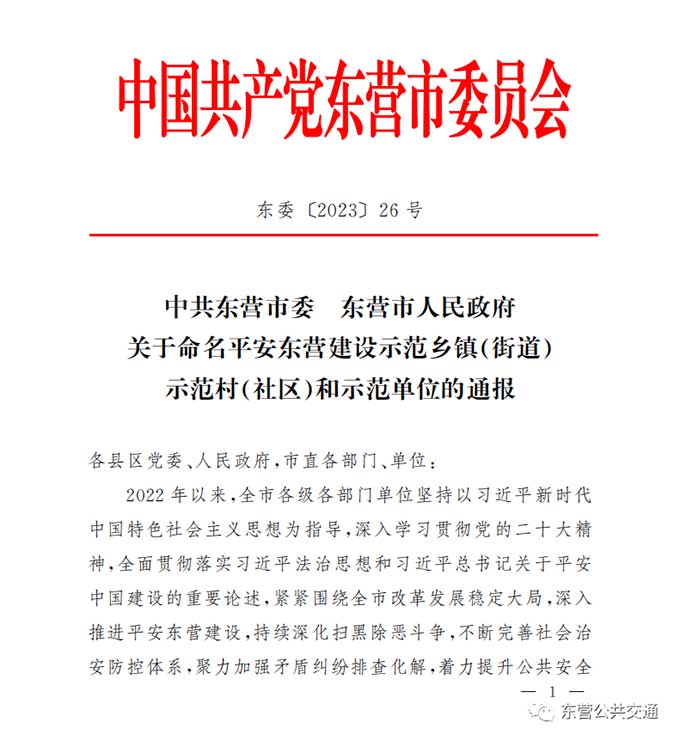 近日,市委市政府聯(lián)合印發(fā)《關(guān)于命名平安東營(yíng)建設(shè)示范鄉(xiāng)鎮(zhèn)(街道)示范村(社區(qū))和示范單位的通報(bào)》(東委〔2023〕26號(hào)),市公交公司再獲表彰,被市委市政府命名為市級(jí)平安交運(yùn)企業(yè)