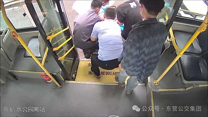 6月2日晚高峰,東營(yíng)街頭車水馬龍。17時(shí)35分,8路公交駛離東趙大廈站,司機(jī)高希明從后視鏡發(fā)覺有些異常:一名剛換座的乘客低垂著頭,臉上也不正常,緊接著身體緩緩滑落在車廂地板上。