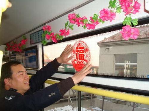 元月11日春運第一天,公交公司8路車組工作人員忙著將自費購買的彩色拉花、剪紙等飾品,張貼、懸掛在車廂內(nèi),積極營造出春運溫馨和諧的喜慶氣氛,與乘客一起喜迎春節(jié)的到來。