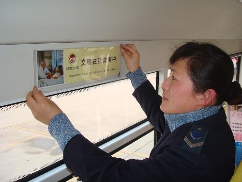 12月11日,市公交公司汽車七隊(duì)8路車組的工作人員把“從我做起,走向文明”的宣傳條幅安裝在車廂,增強(qiáng)公交文明教育對社會(huì)的示范性和輻射性。