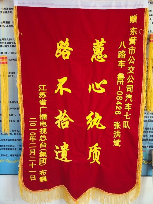 原來,2月20日,初次來東營走親訪友的失主布巍小酌后準(zhǔn)備返程,不小心將手提包丟在8路車上,內(nèi)有DV機(jī)、出國護(hù)照和工作證等物件,年后就準(zhǔn)備出國的他非常著急。經(jīng)過查詢與汽車七隊取得聯(lián)系,當(dāng)?shù)弥眯鸟{駛員張洪斌已將失物及時上交車隊,失主布巍非常感動,因急于趕回單位出國,沒能當(dāng)面致謝,特寄來錦旗表示謝意。