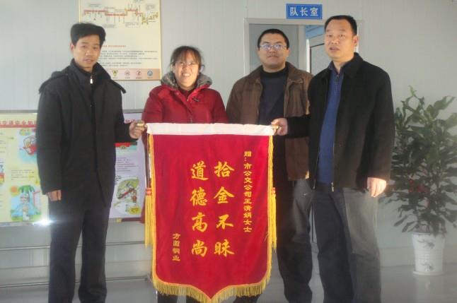 12月11日上午,東營經(jīng)濟開發(fā)區(qū)方圓銅業(yè)的武繼峰先生拿著一面寫有“拾金不昧、道德高尚”的錦旗來到市公交公司汽車五隊,感謝161路駕駛員王清娟師傅拾金不昧的高尚品德。據(jù)車隊了解得知,12月9日晚上,汽車五隊駕駛員王清娟在運行完161路班次后正常清理車廂衛(wèi)生時發(fā)現(xiàn)了一個女士皮包并立即將皮包上交車隊。車隊值班人員通過清點,發(fā)現(xiàn)皮包內(nèi)共有現(xiàn)金、手機、鑰匙、身份證、個人用品等,根據(jù)包里面的手機信息及時聯(lián)系到了失主的丈夫武繼峰先生。12月10日上午武繼峰先生帶著有效證件來車隊將包領(lǐng)回?;丶液?,武繼峰先生心情久久不能平靜,特意制作了一面錦旗送到車隊,代表全家來表達感激之情,武繼峰先生拿著錦旗,握著王隊長的手,非常激動的連連表示感謝,并再三要求車隊對王清娟師傅這種拾金不昧的優(yōu)良品質(zhì)進行表揚。王隊長非常坦誠的告訴武繼峰先生,拾金不昧是我們公交行業(yè)多年來始終堅持秉承的優(yōu)良傳統(tǒng),也是每名駕駛員應(yīng)盡的義務(wù),是我們公交人義不容辭的責(zé)任。