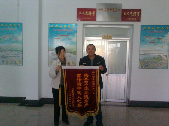 11月12日早上,山東天園銅業(yè)有限公司的耿愛(ài)華女士拿著一面寫有“拾金不昧品德高尚、雷鋒精神感人之深”的錦旗來(lái)到市公交公司汽車一隊(duì),感謝車隊(duì)駕駛員王波師傅拾金不昧的高尚品德。據(jù)車隊(duì)了解得知,11月8日,耿愛(ài)華女士乘坐王波師傅駕駛的值班車上班。上班后發(fā)現(xiàn)裝有3000多元現(xiàn)金和手機(jī)的錢包不見了,她心急如焚,當(dāng)時(shí)就癱坐在地上。正在這時(shí),耿愛(ài)華女士的一位同事前來(lái)告訴她丟失的錢包找到了,公交公司汽車一隊(duì)駕駛員王波師傅剛打來(lái)電話,錢包內(nèi)的3000多元現(xiàn)金和手機(jī)都在,讓她放心。原來(lái),王波師傅執(zhí)行完任務(wù)回公司打掃車內(nèi)衛(wèi)生時(shí),發(fā)現(xiàn)座位夾縫中有一個(gè)錢包,打開一看里面那么多現(xiàn)金,心想失主一定很著急,便通過(guò)錢包內(nèi)手機(jī)記錄的電話聯(lián)系到耿愛(ài)華女士的一位同事,讓她通知耿愛(ài)華女士及時(shí)到市公交公司汽車一隊(duì)領(lǐng)取。
