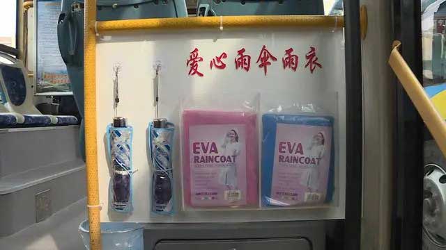 在東營市公交公司汽車三隊停車場,駕駛員李斌像往常一樣,把自己駕駛的38路公交車仔仔細(xì)細(xì)打掃了一遍。記者在他的車上,還看到了一些特別的便民物品:前排的礦泉水、藥箱,后排的便民雨傘、雨衣。李斌告訴記者,這些都是他自己購置安裝的,就是為了方便乘客。